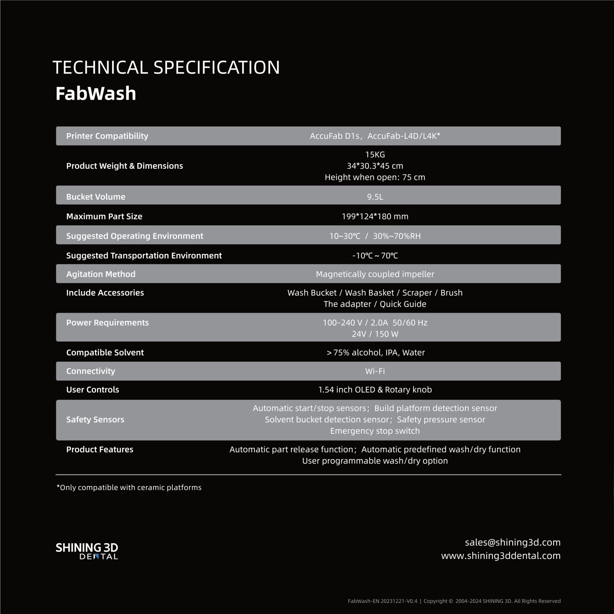 FabWash is an end-to-end, automated part-release, washing, and drying system built for dental 3D printing. Load your AccuFab build platform, select the material profile, and FabWash does the rest: automatic release, optimized wash motion, and dry then it lifts the parts and build platform out of solvent so theyโre ready when you are.