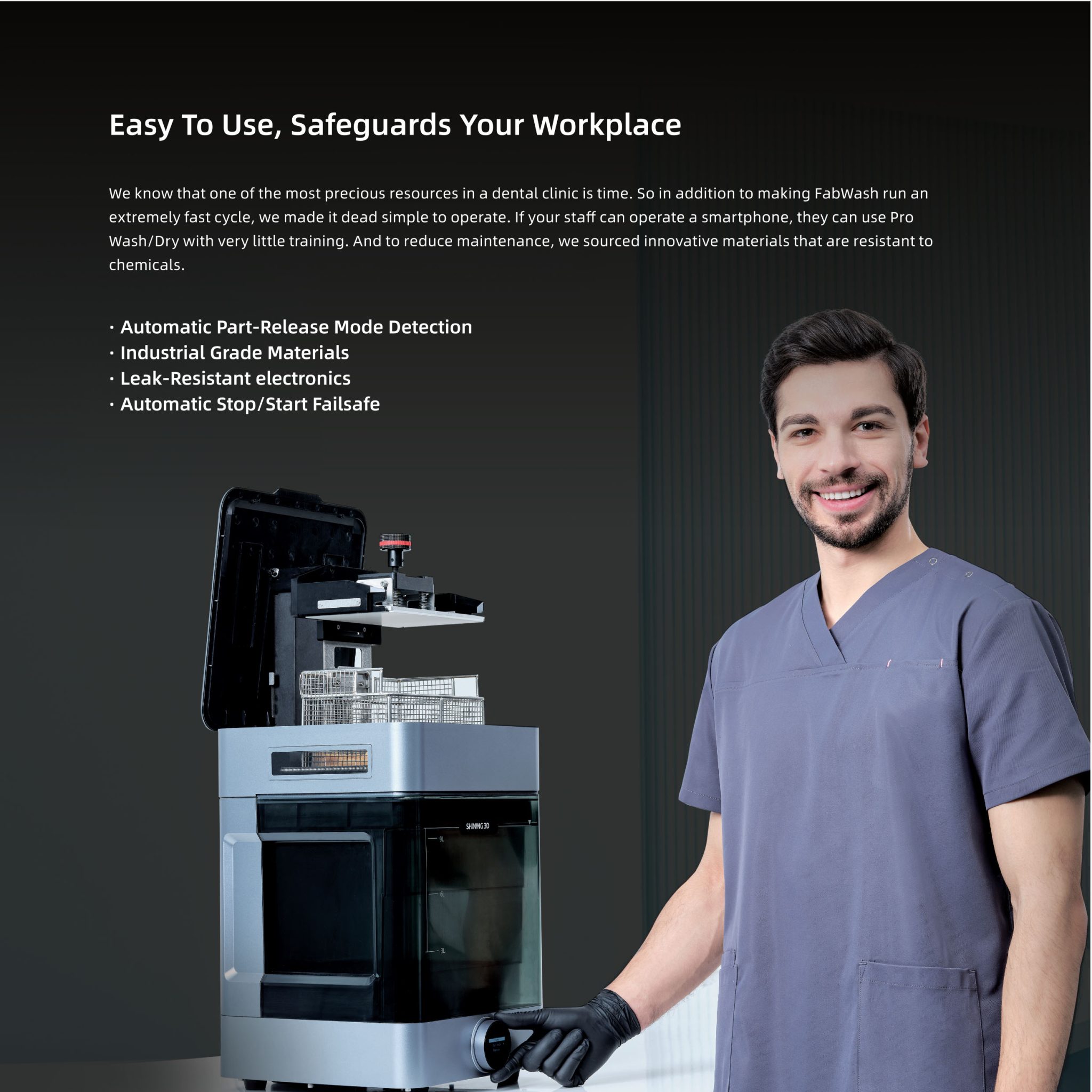 Integration help: Weโll align FabWash profiles to your resins, printers (L4D/L4K, D1s, CEL, F1), and infection-control protocols.