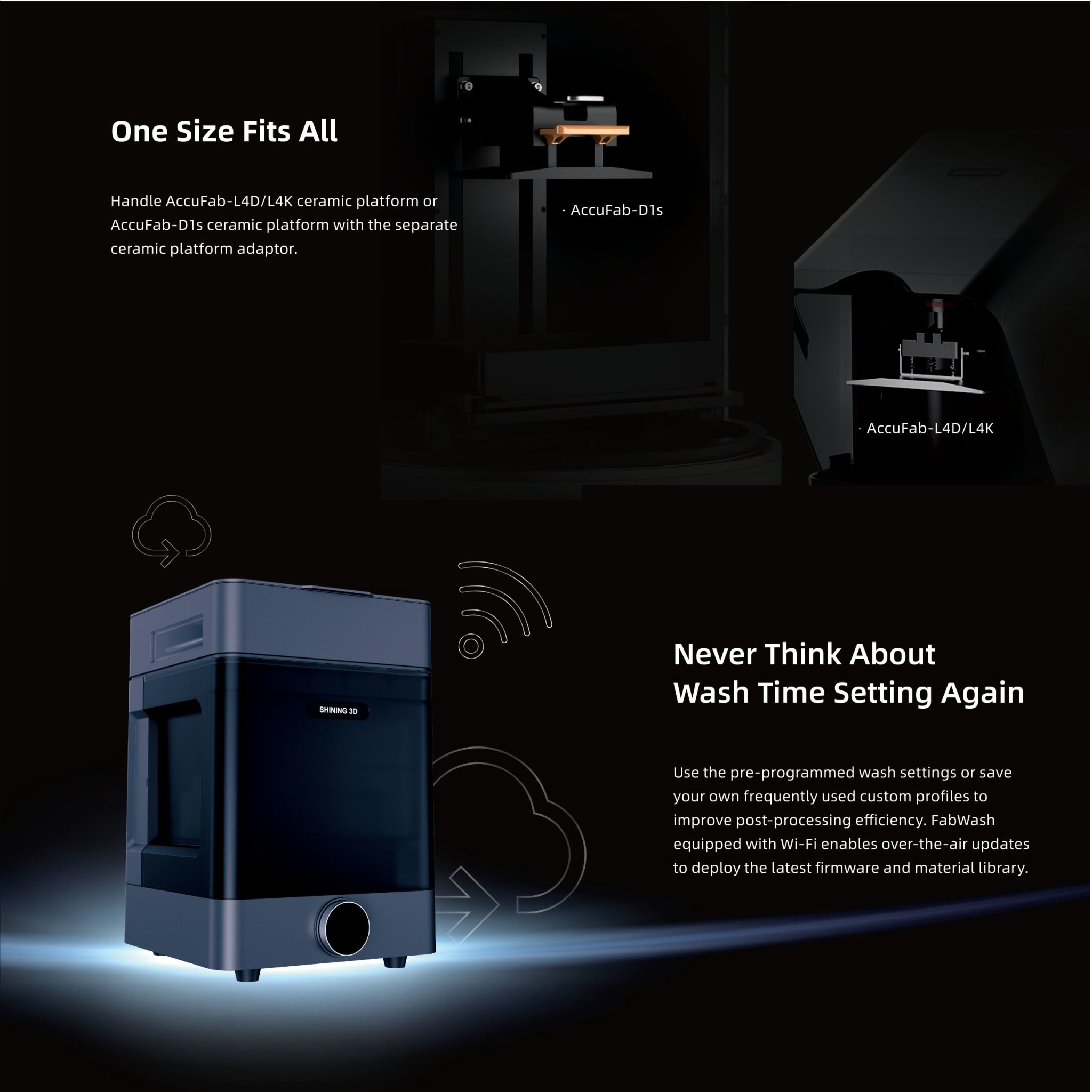 AccuFab-L4D/L4K platforms fit directly; D1s platforms use the included adapter. FabWash also lists compatibility with CEL and F1.