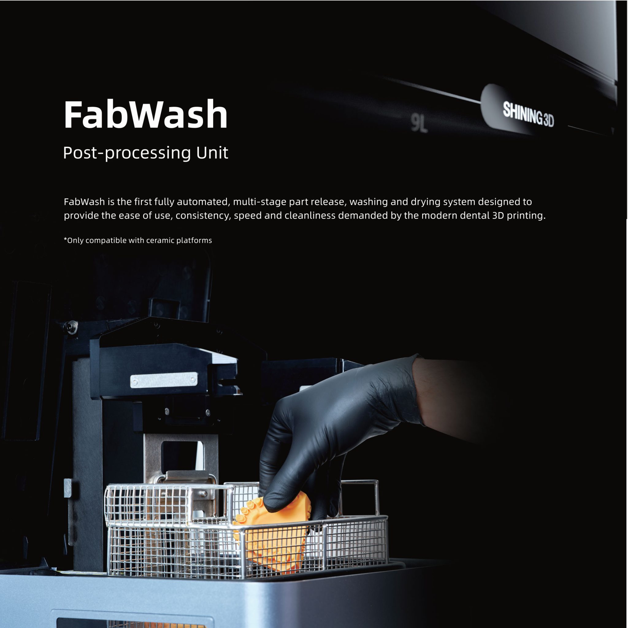 FabWash automates release, wash, and dry. For post-curing, use FabCure 2 or Fabcure N2 (sold separately).