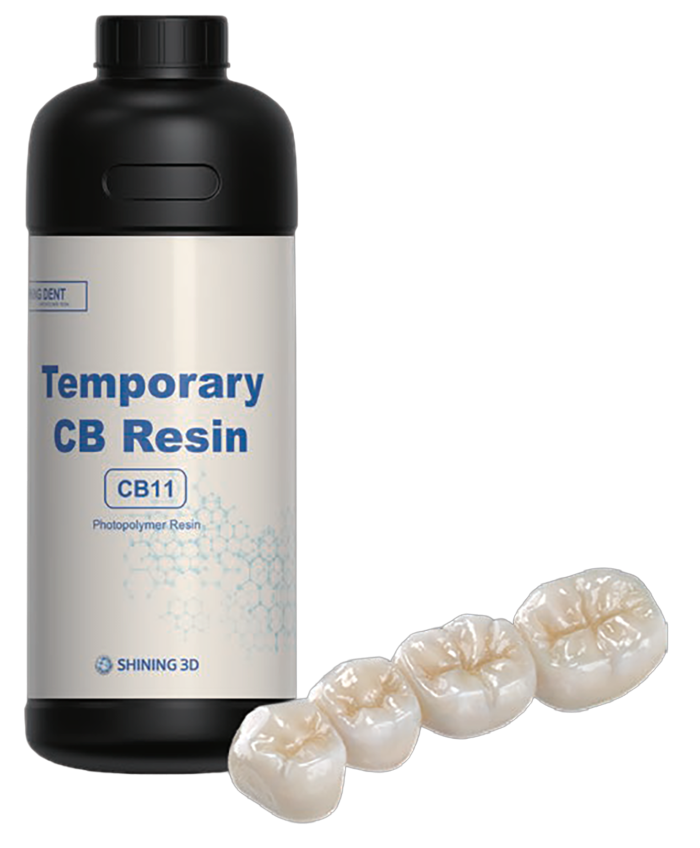 CB11 is an ideal choice for printing crown and bridge with perfect performance in colors, morphology, occlusion, etc. This material undergoes MMA&THF-MA free which is even safer in use of sensitive users. This material has features including high toughness, high pressure resistance, high flexural strength with low water absorption after testing in oral devices real anti-aging performance. The flexural strength can be maintained above 115MPa after a long-accelerated aging test. The low risk of CB11 fracture after wearing, the safer when patientโs chewing.
