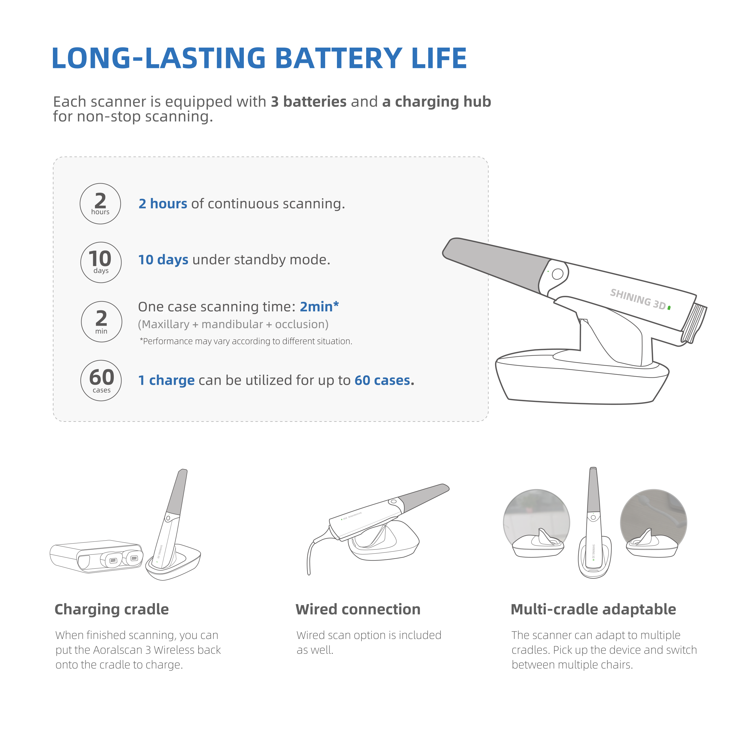 Being Wireless adds ease and comfort to your scanning in your practice. The amazing wireless technology is fast and stable so whether you use the Aoralscan 3 Wirelessly or Wired you get the same fast scanning ability.